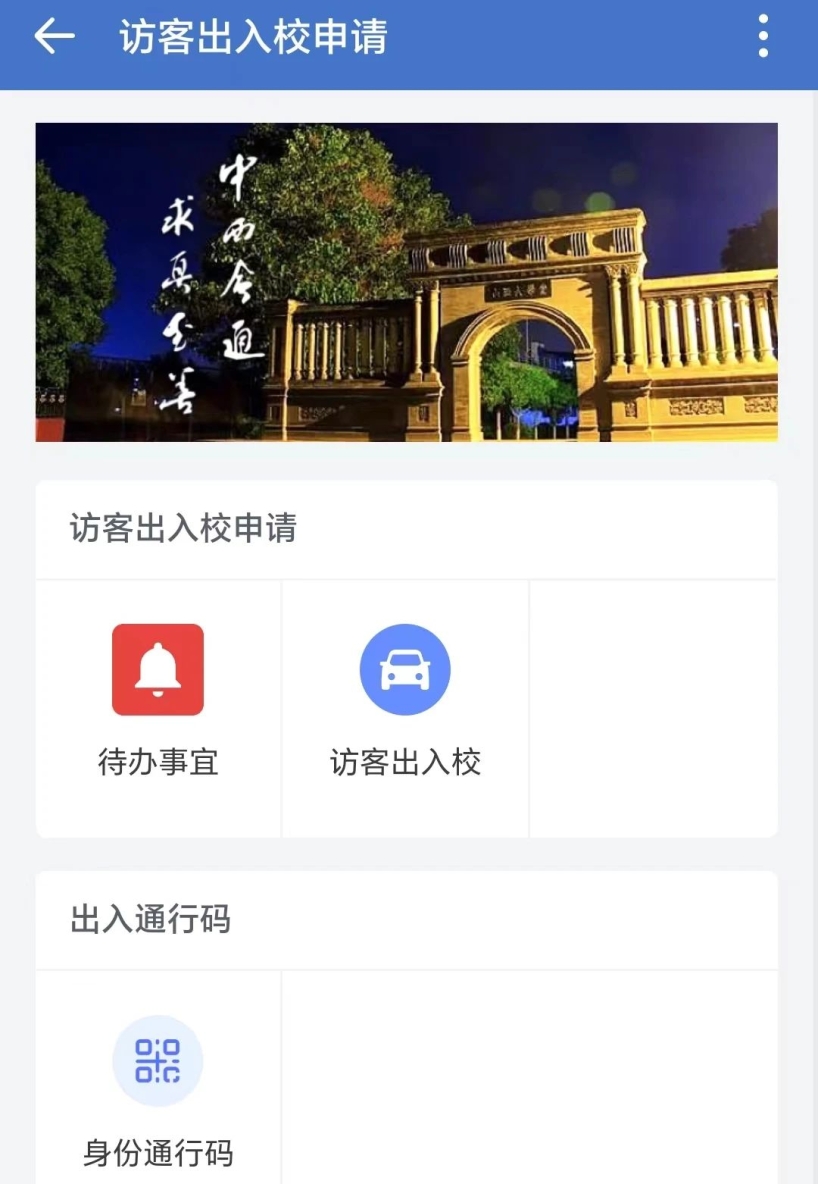 完成身份认证后,点击【校外人员出入校申请】—【访客入校申请】,填写相关信息。流程提交后,受访人可在太阳集团城娱8722企业微信上完成审批办理,访客可在【待办事宜】查看流程进度。流程结束后,访客点击【身份通行码】,凭入校申请码(又称绿码)经校门卫查验后即可进校。